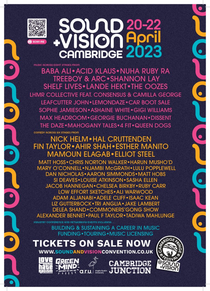 The Cambridge Fringe is a comedy festival in Cambridge 20-22 April 2023. It is part of the Sound and Vision Convention, a multi-venue festival featuring more than 70 acts (both new and established) from the worlds of music and comedy.